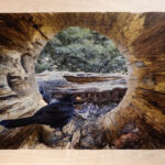 Esko Rantanen esittelee koivuvanerille käsityönä tekemiään luontokuvia museon